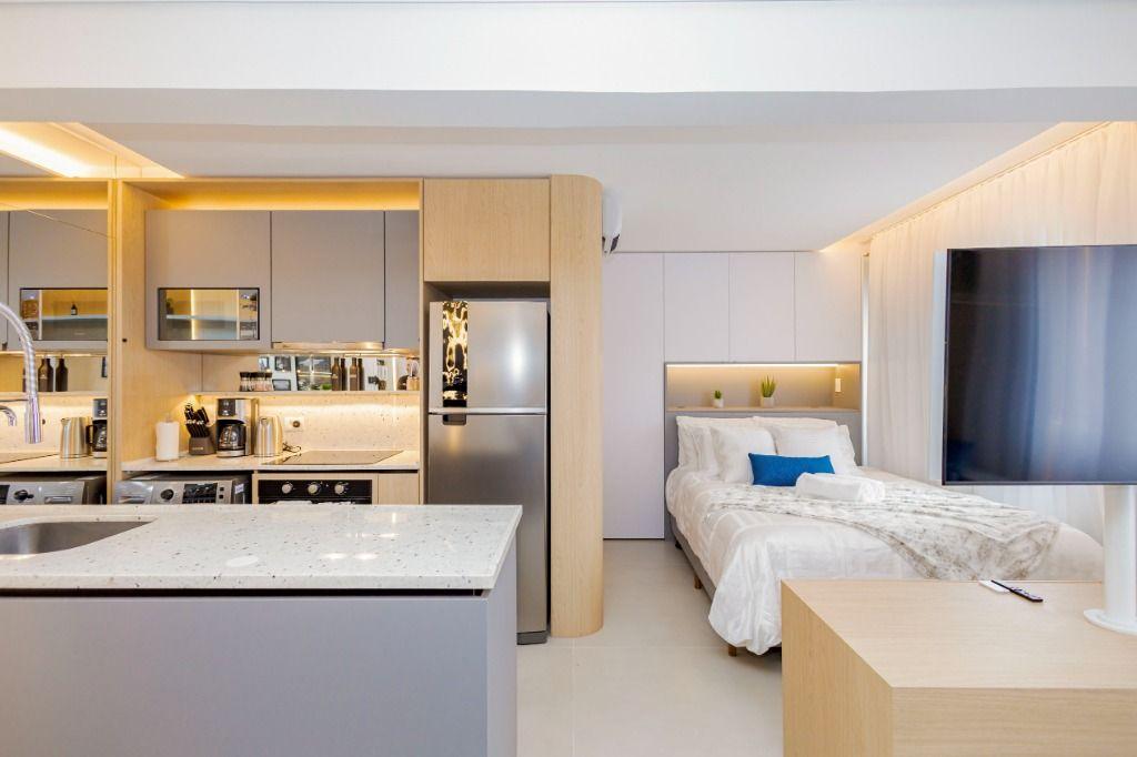 Studio todo reformado com acessórios de qualidade e ótimo gosto. Cozinha planejada com móveis de primeira linha, ficando cooktop, forno e coifa. Sala conjugada com o quarto em teto em gesso e iluminação em led. No banheiro vidro em blindex. O imóvel está localizado em frente a Faculdade Evangélica Mackenzie no Bigorrilho.